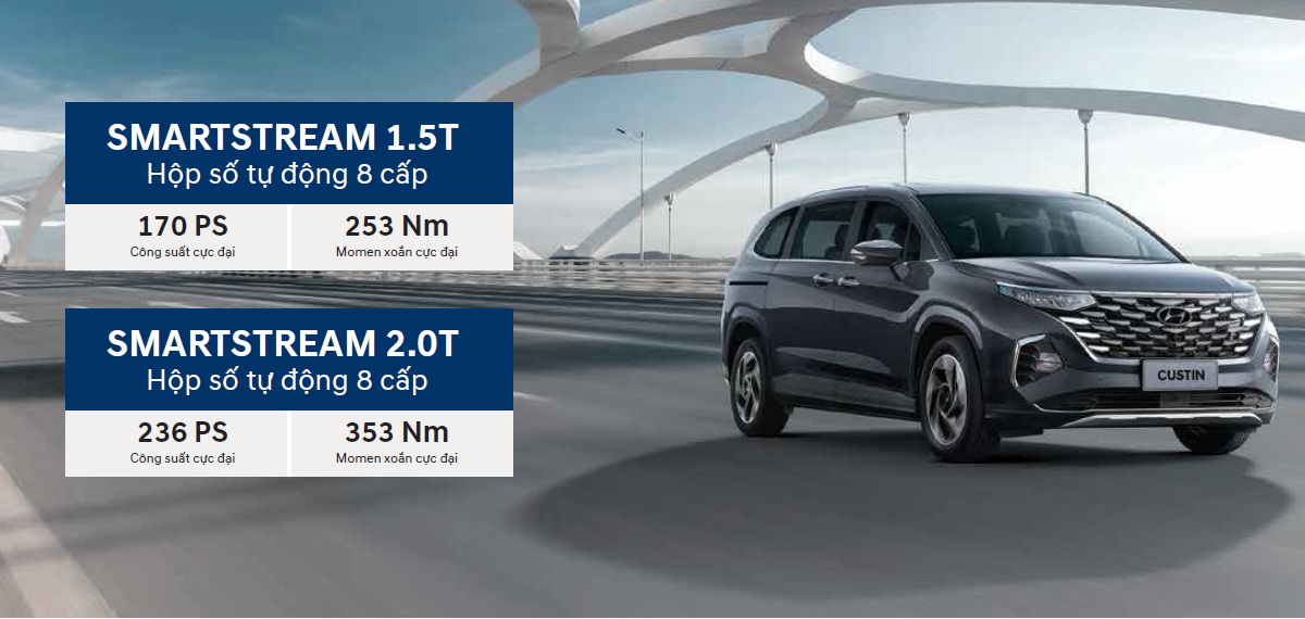Hyundai Custin vận hành mạnh mẽ và êm ái với 2 tùy chọn động cơ turbo smartstream thế hệ mới: 1.5 T-GDI và 2.0 T-GDI.